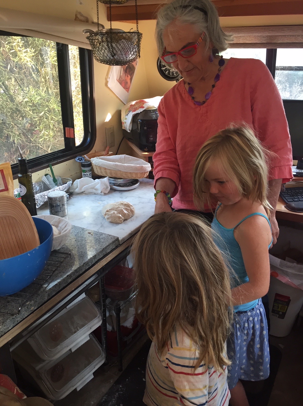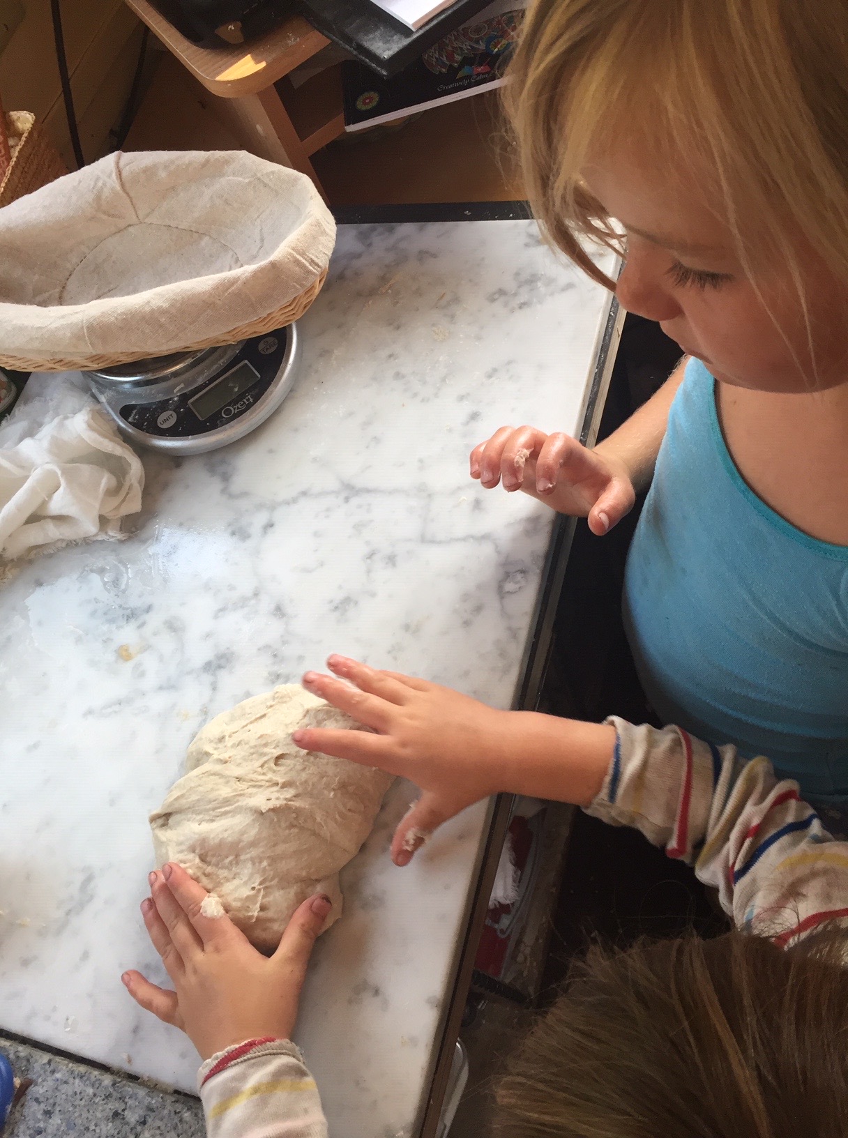 Now back to Sourdough September. I hosted my first sourdough class here at the Highlands Bread Shoppe. My friend Sarah who runs Wellstone Center in the Redwoods came with her daughters: Coco and Anais ( 6 and 4 year old) and 2 2o- something- year -old interns who are getting a chance to pursue their writing while earning their keep by doing the jobs required on this beautiful piece of land.. One of their gigs is to learn to bake bread! We debated the likes of wet v dry starters, slap and fold methods v stretch and fold methods, when to score bread, how long to let dough sit, how to get dough to have a more sour flavor, How do you get a decent crust? Playing “dough ” can go on for hours.There are just 4 ingredients: flour, salt, water and starter and there is the intangible 5th ingredient which I call Time and Temperature which is at the discretion of the baker to play with.